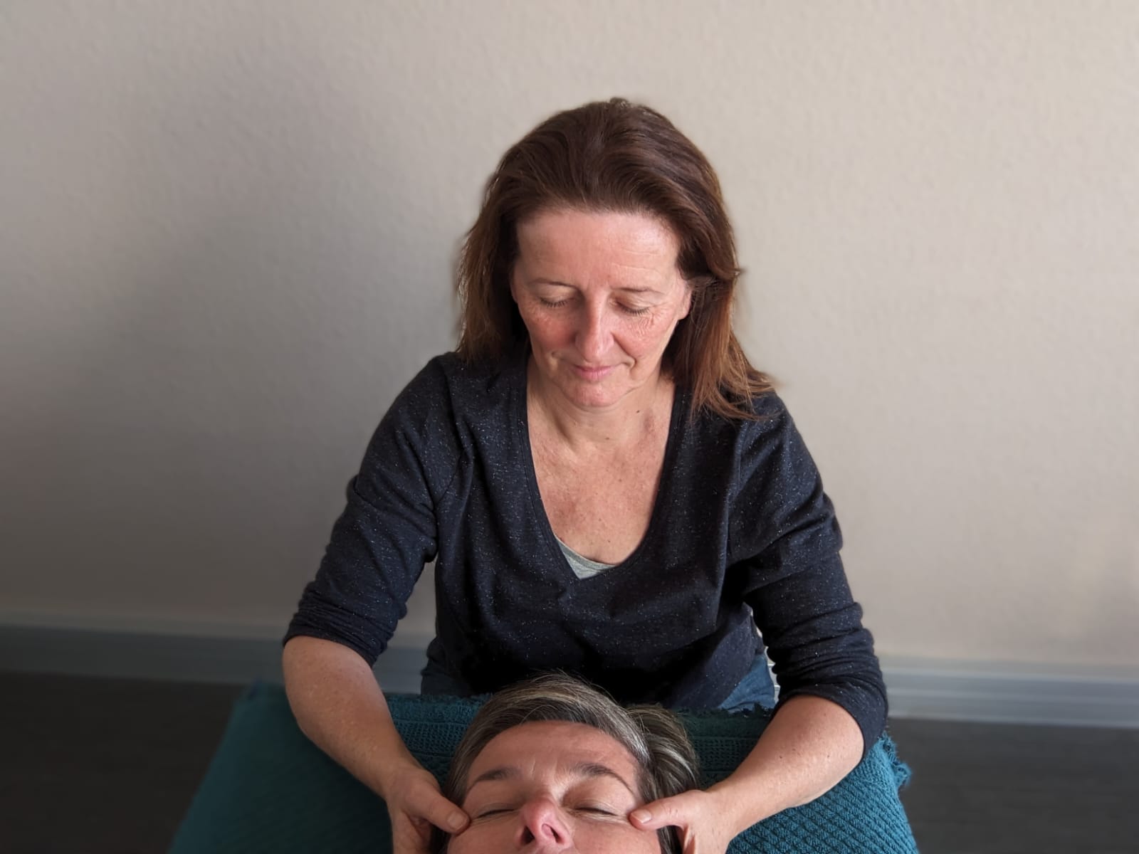 On choisira le crâne et le visage pour un apaisement du mental, les maux de tête, l'anxiété, le sommeil, la détente nerveuse et du visage.